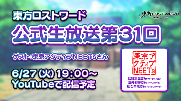 6月27日(火)19:00より、東方LostWord公式YouTubeチャンネルにて、ゲストに音楽サークルの東京アクティブNEETsさんから、サークル代表の紅維流星さんとベースパートの蒼井刹那さん、サックスパートの山石本薫さんを迎え、公式生放送を行います。ゲーム最新情報はもちろん、MVプロジェクト最新曲のご紹介、ゲストの東京アクティブNEETsさんへの質問コーナーなどがありますので、どうぞお見逃しなく!