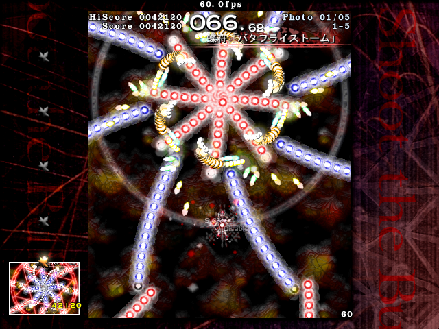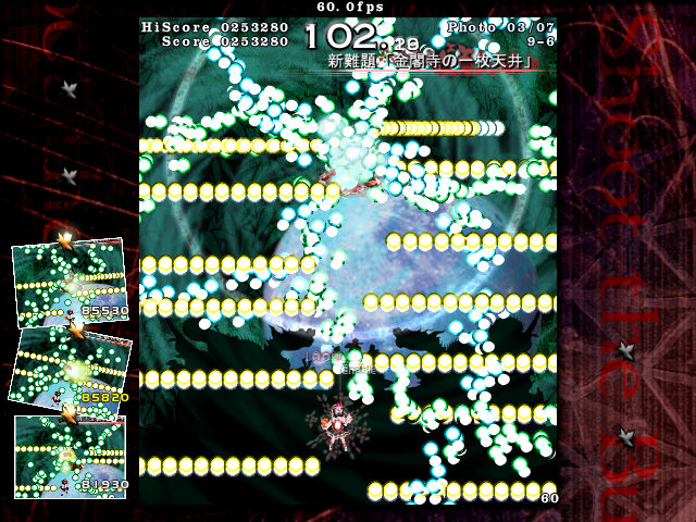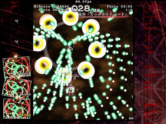 東方文花帖 ~ Shoot the Bullet. ゲーム 幻想郷のブン屋(新聞記者)、射命丸文が、取材対象の写真を撮って倒す外伝的な作品。 美しく激しい弾幕をカメラに収め、天狗らしい視点で、偏見と欺瞞に満ちた記事にまとめます。 東方Project第9.5弾。 敵をシュート(撃ち落とす)するのでは無く、シュート(撮影)して精神的ダメージを与えるゲームです。 色んなキャラが出てくるファンサービス的な作品です。