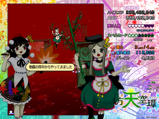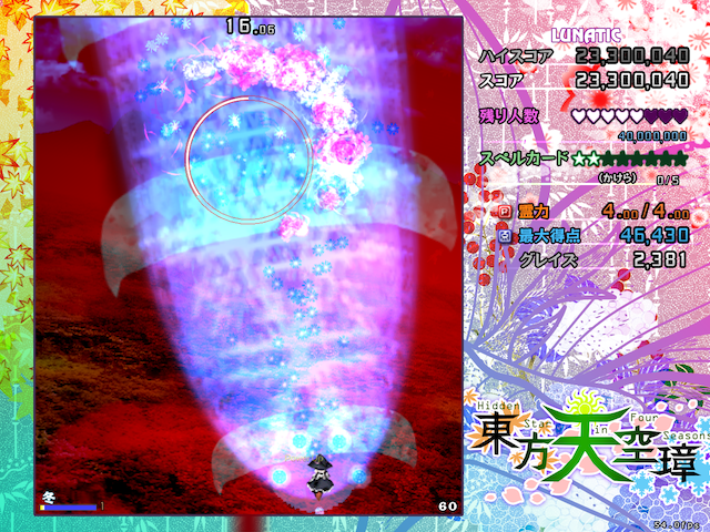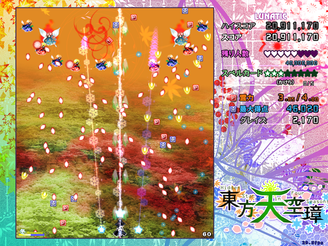 東方天空璋 ~ Hidden Star in Four Seasons. ゲーム 花畑ではひまわりが咲き、山では紅葉し、神社では桜が舞い、森では雪が降っていた。 異常気象を越える判りやすい異変に、霊夢達は気合いが入っていた。 これは久々に解決しがいのある異変だ、と。 しかし異常な季節の裏には、決して表に出てくることのない想像を絶した世界が広がっていた。 東方Project第16弾。 四季折々を感じられる序盤から、突然全ての生き物の背中から不気味な世界へと繋がっていく摩訶不思議な作品。 この作品は、幻想郷の成り立ちに関連するキャラクターや設定が多数出てきます。